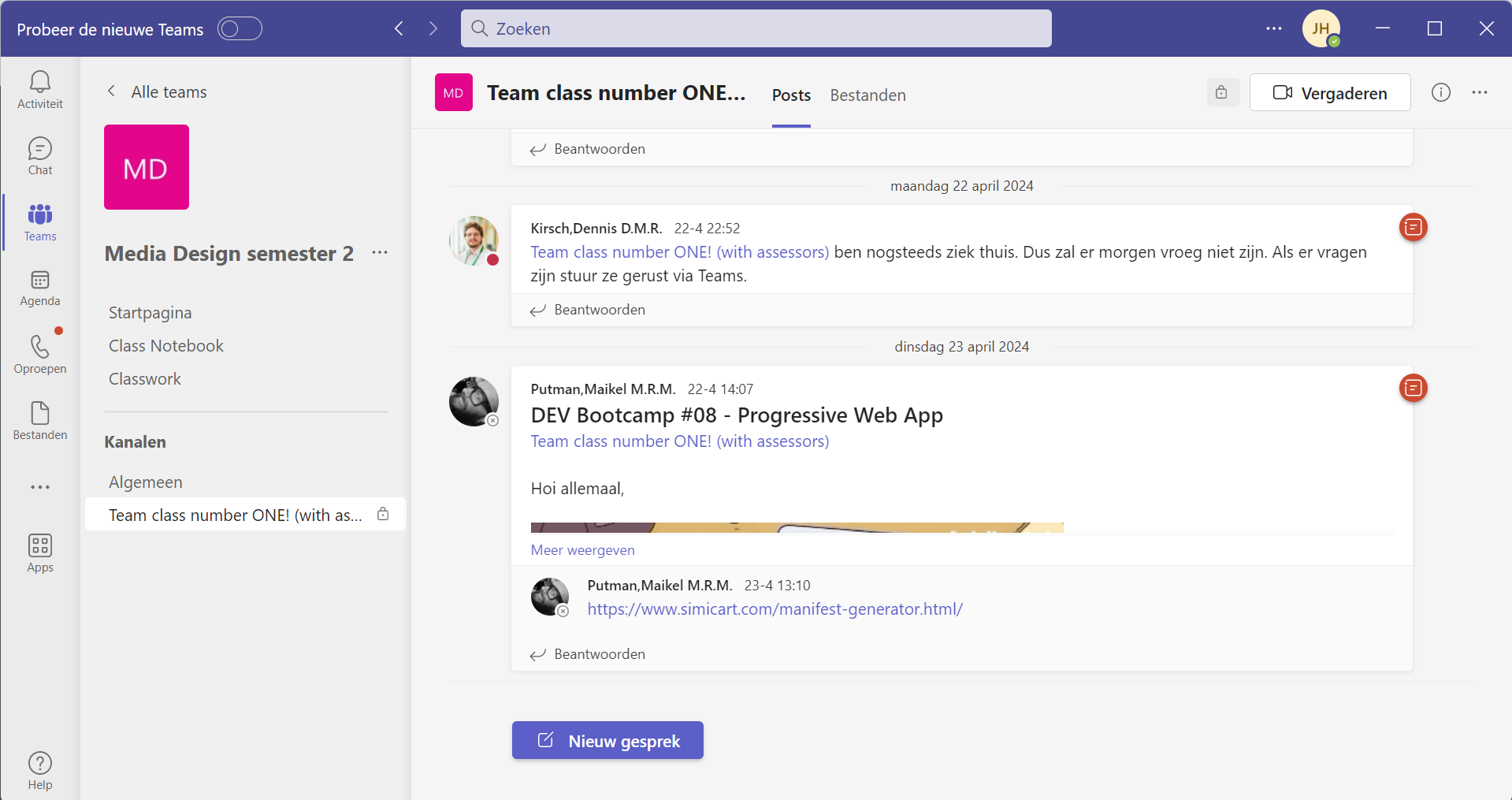 Ook kan ik eventueel via Teams mijn stellen en feedback vragen.